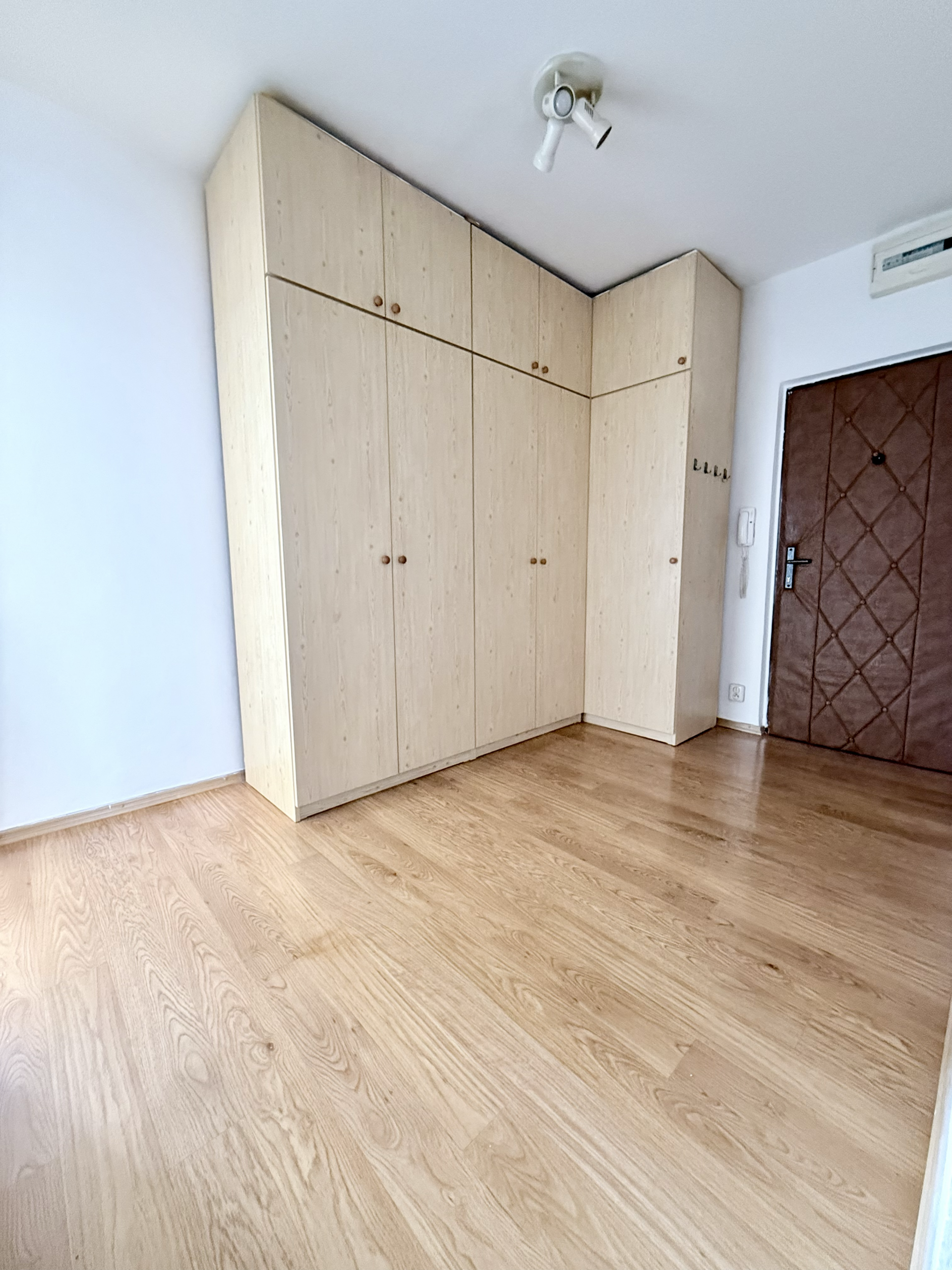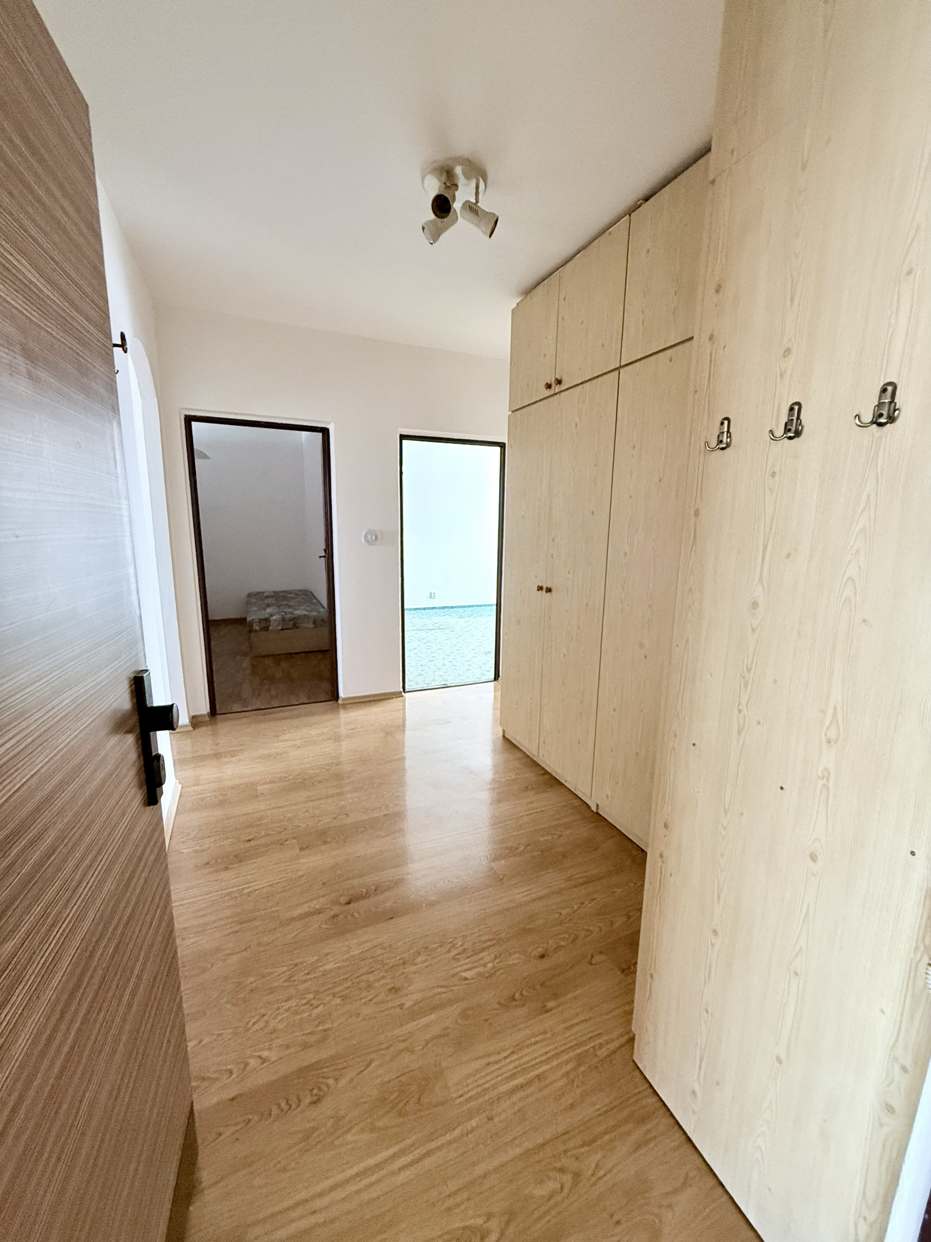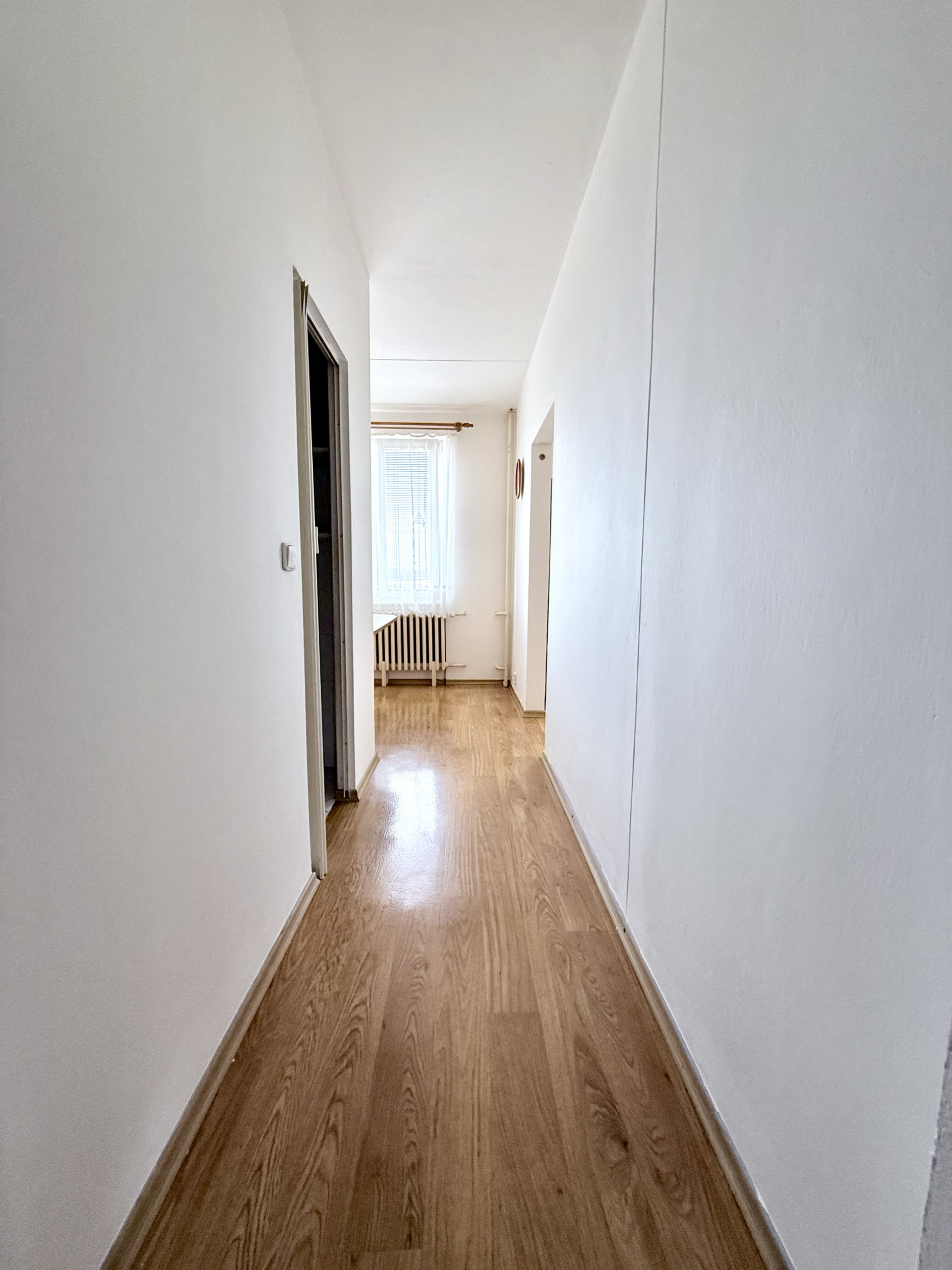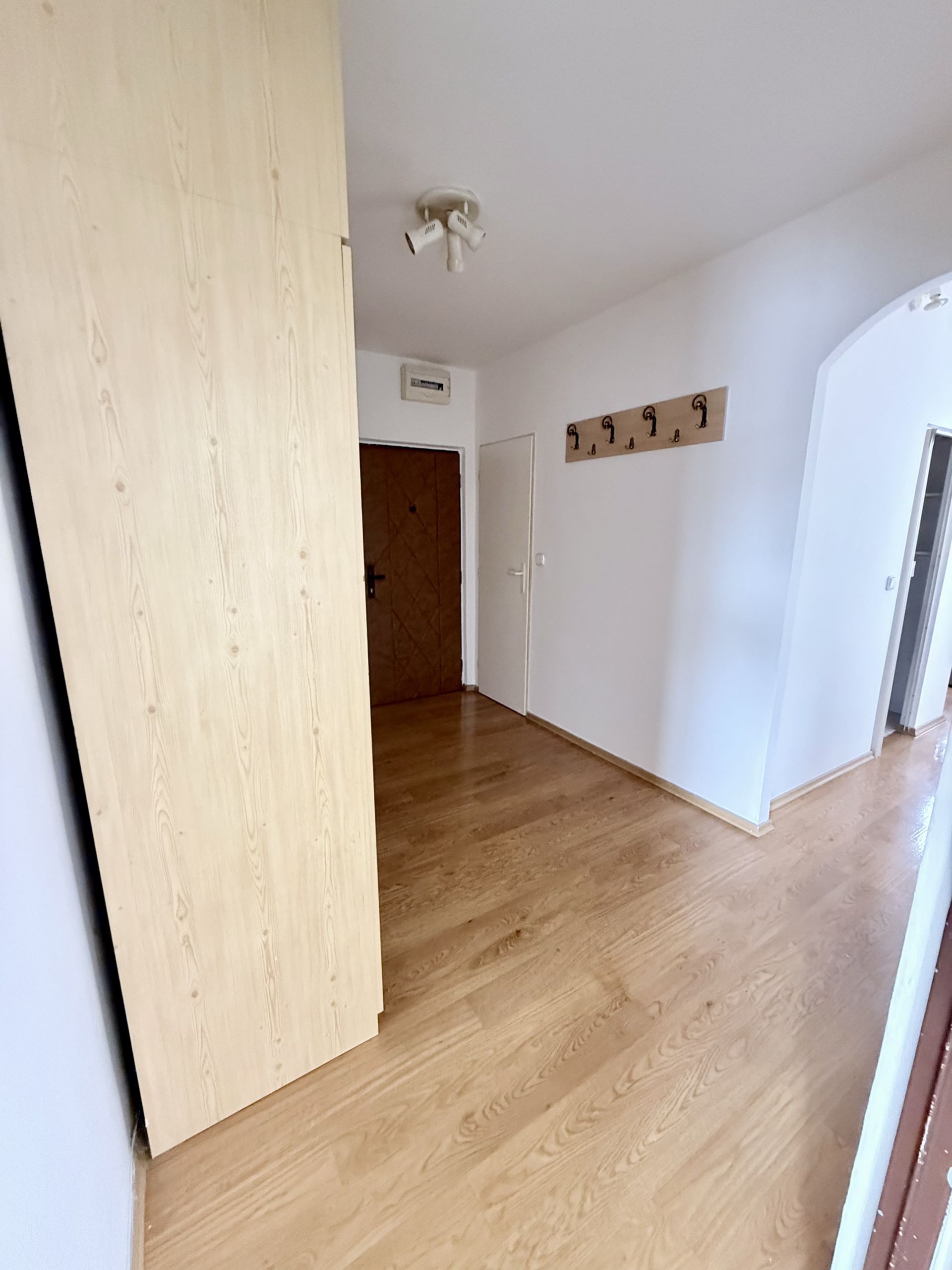 Současně byla odstraněna komora na chodbě, což otevřelo prostor pro praktické řešení s úložnými skříněmi. Byt má také zděné jádro a koupelna je chytře přístupná ze spojovací chodby mezi chodbou a kuchyní.