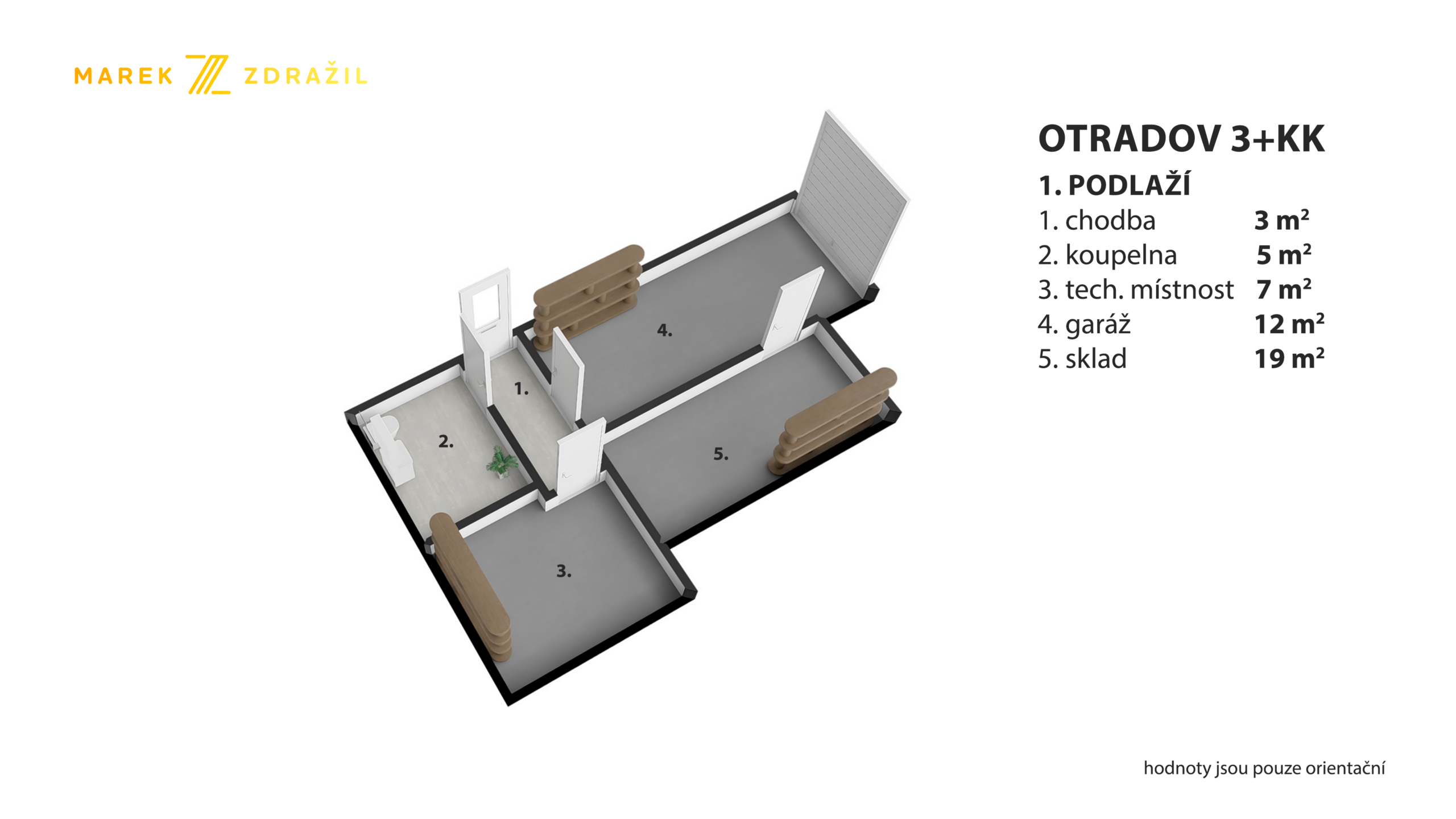 Přízemí: garáž, sklad, technická místnost s plynovým kotlem a venkovní koupelna s WC – praktické řešení po práci na zahradě.