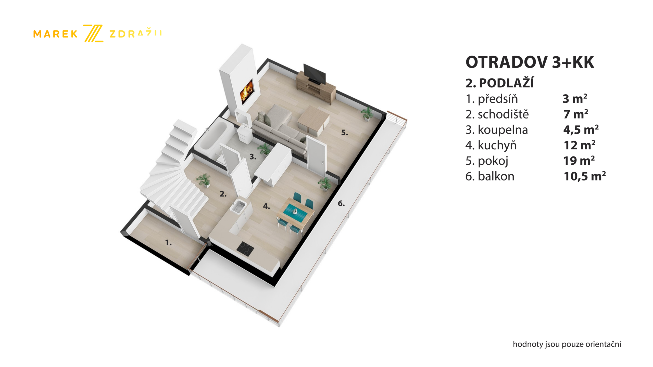 2NP: vstupní chodba, koupelna s WC, kuchyň a obývací pokoj s možností využití krbu.