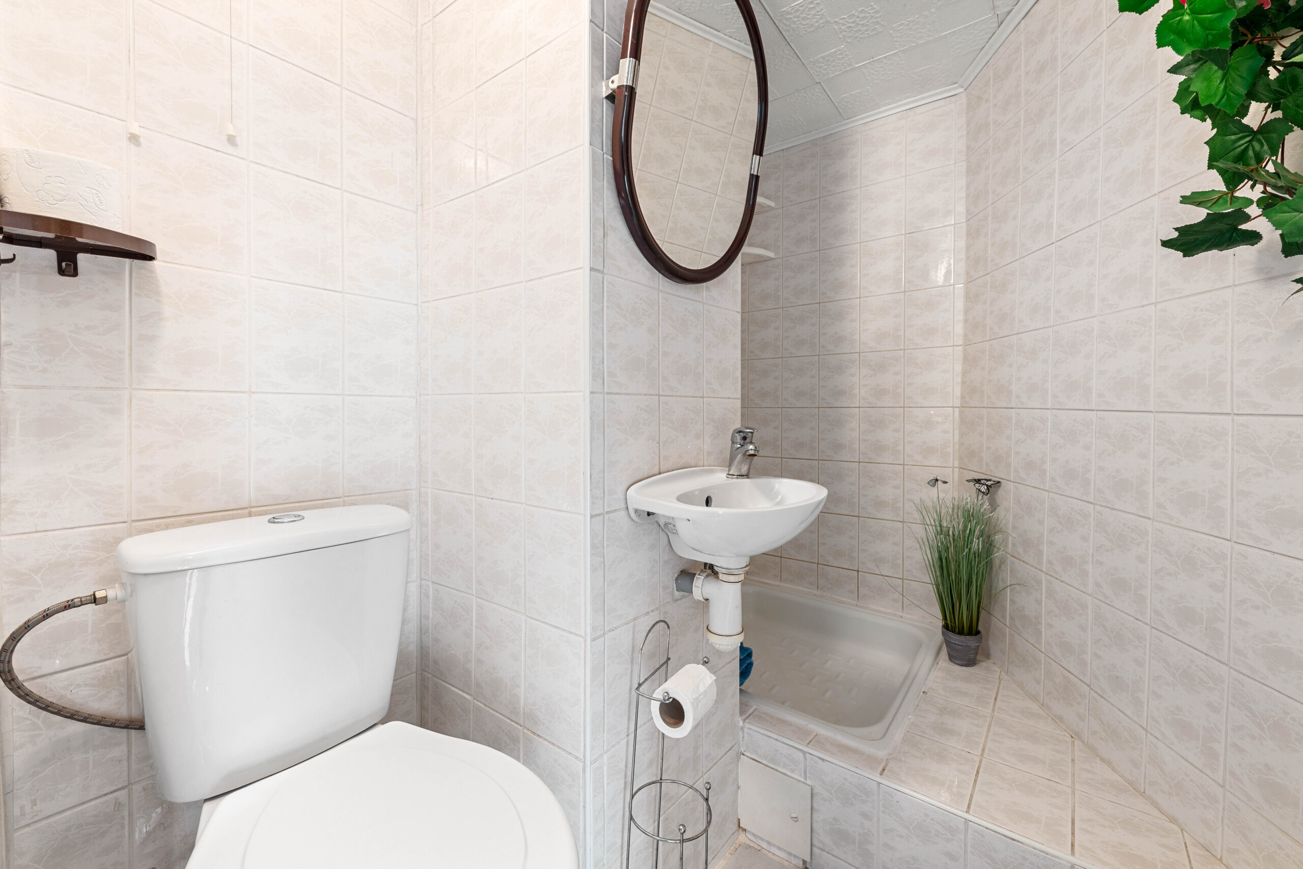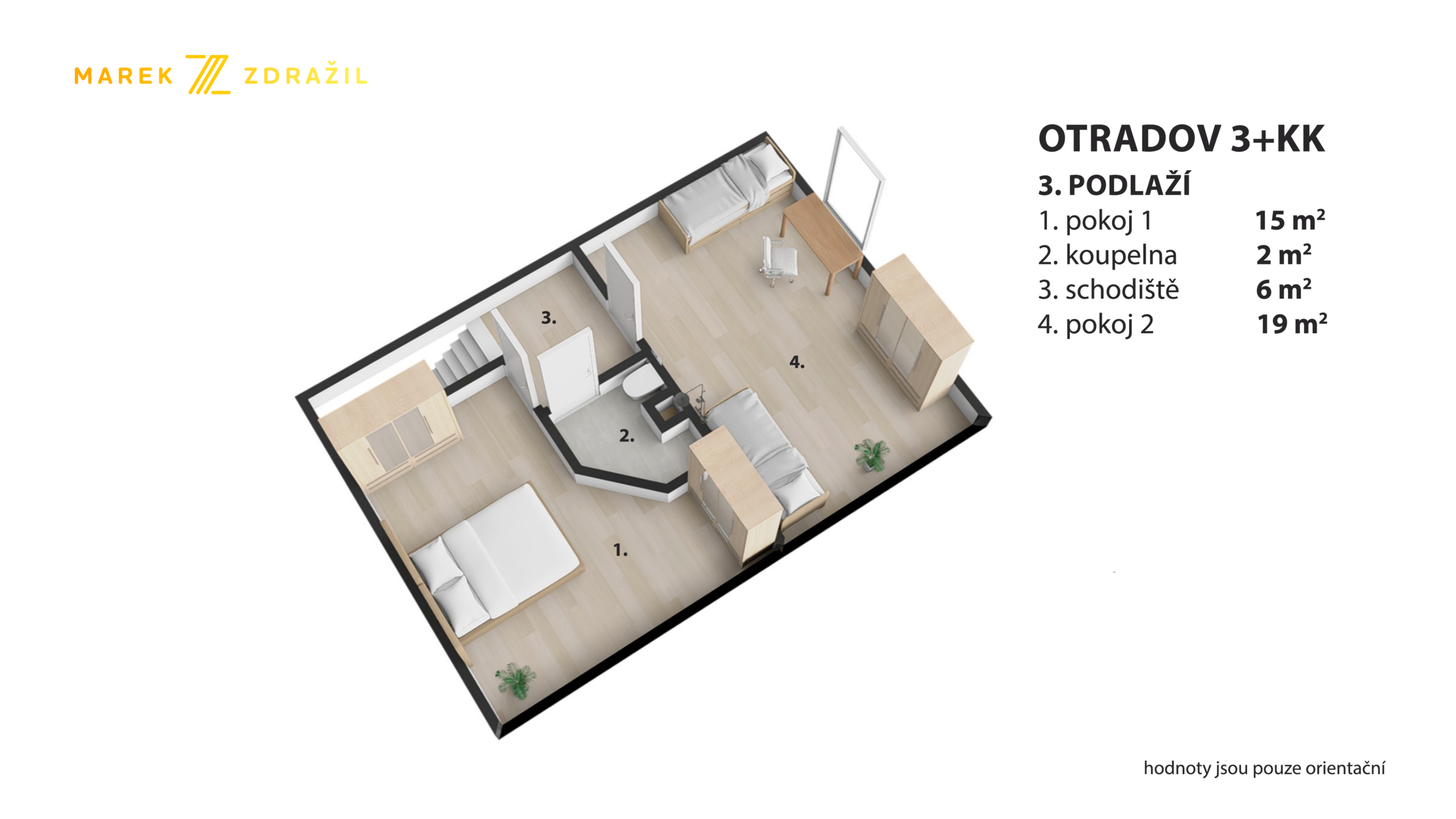 1NP: dvě neprůchozí místnosti, sprchový kout a toaleta – vhodné jako ložnice, pracovna nebo pokoj pro hosty.