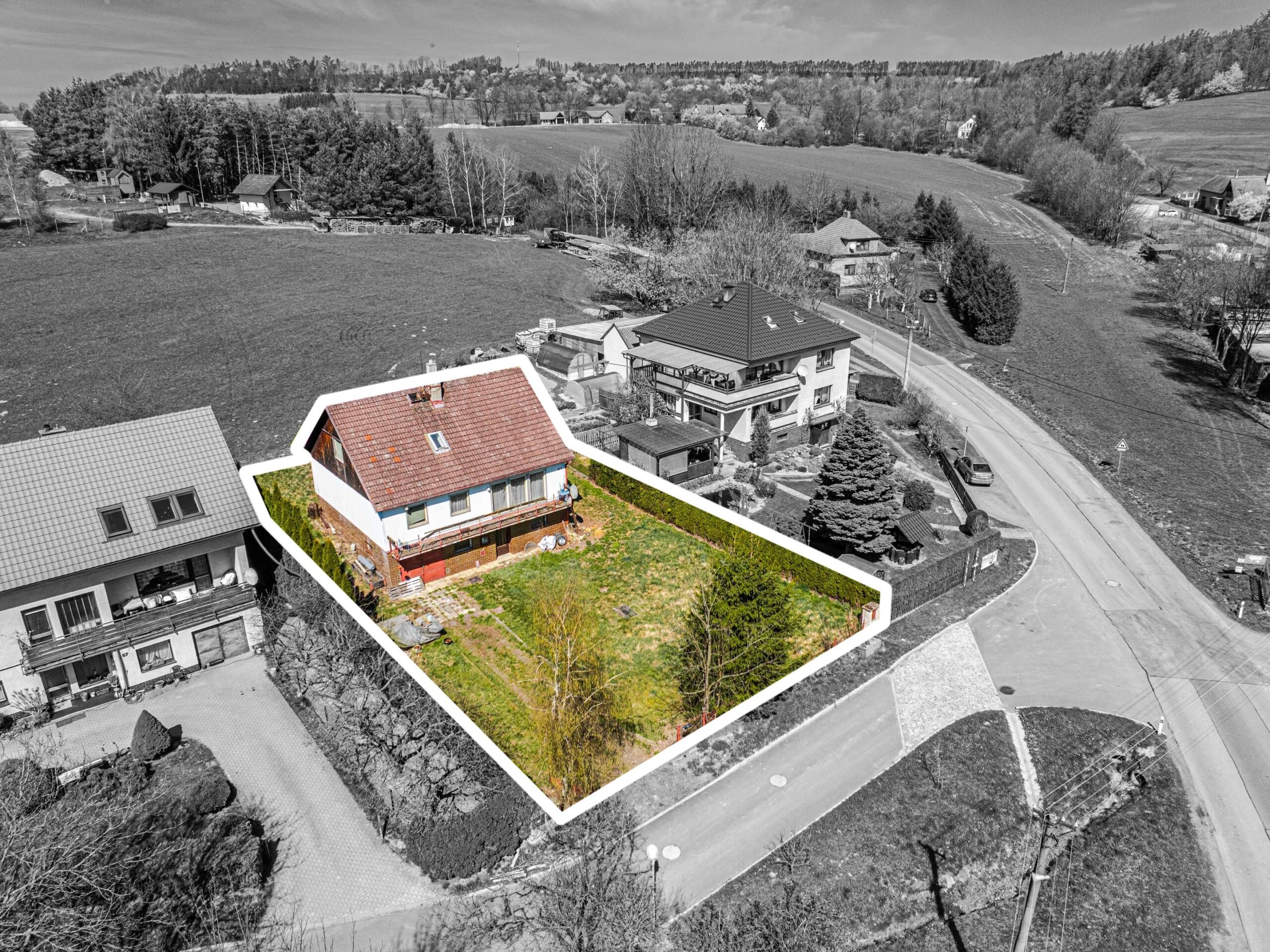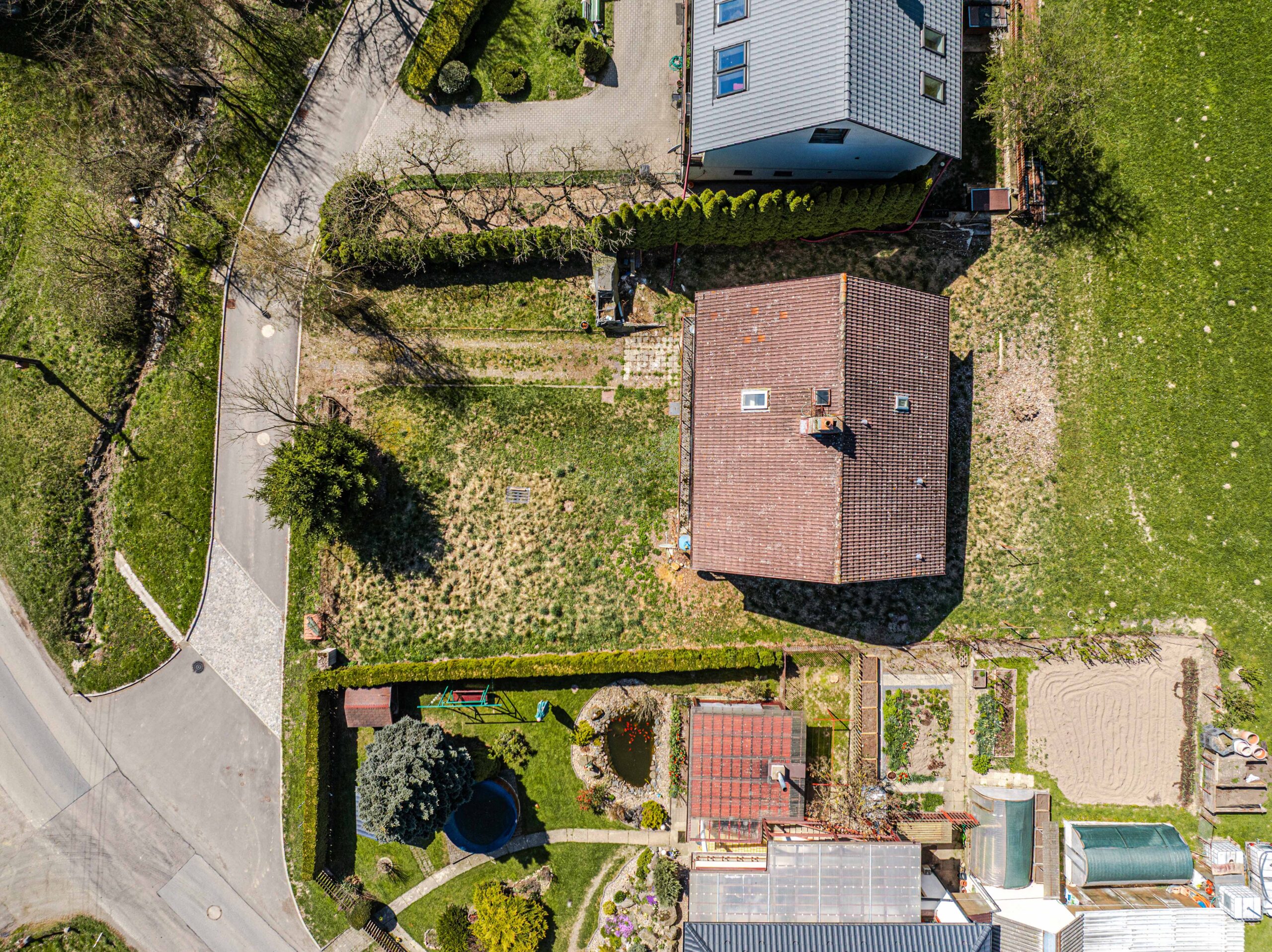 Větší část pozemku se nachází před domem, kde je dostatek prostoru pro zahradu, odpočinkovou zónu i parkování. Menší část navazuje za domem.
