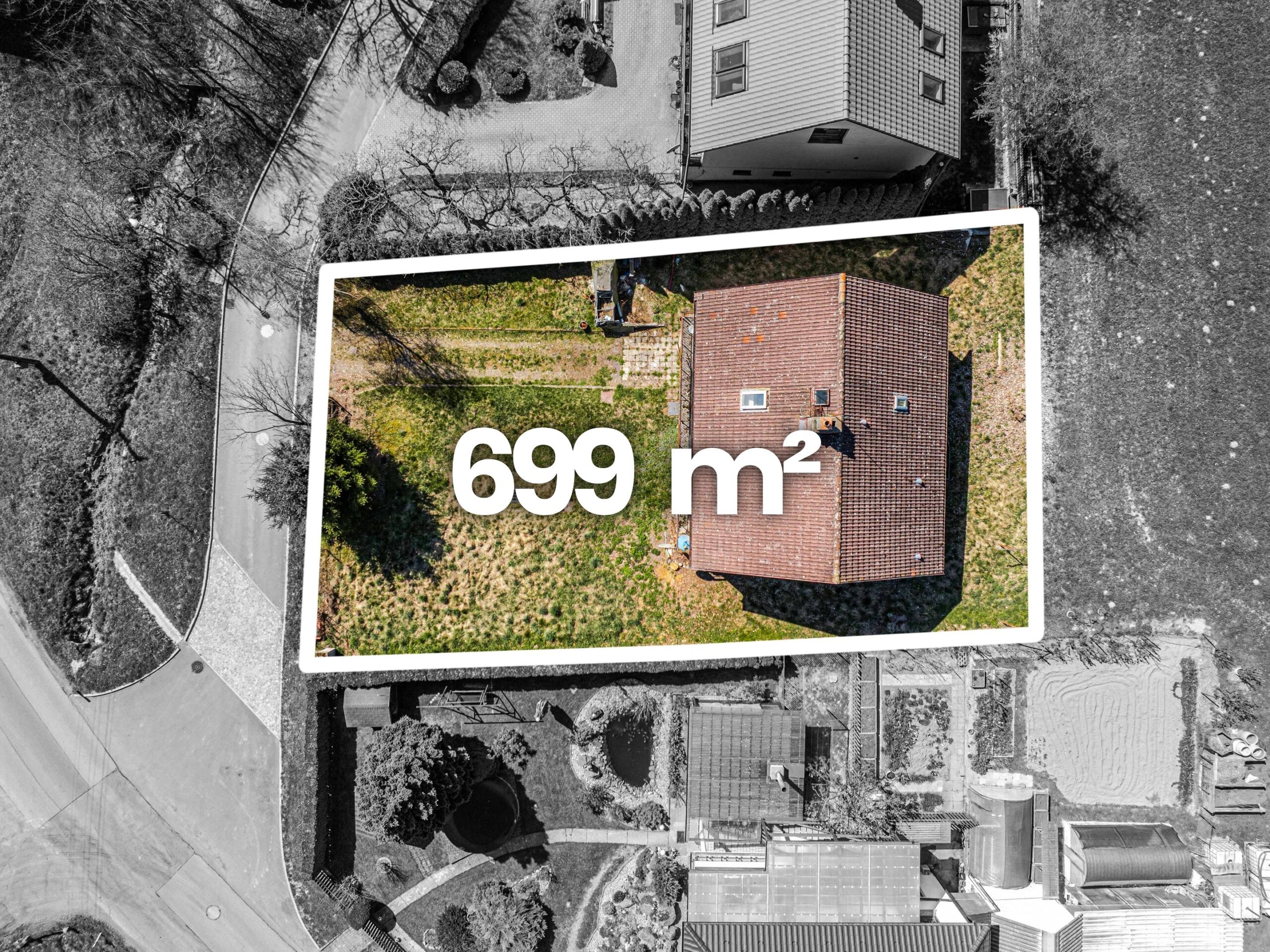 Celková plocha pozemku činí 699 m², zastavěná plocha domu je 117 m².